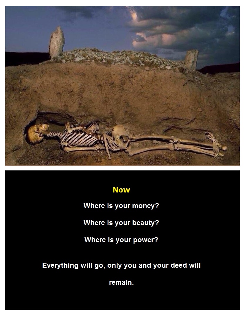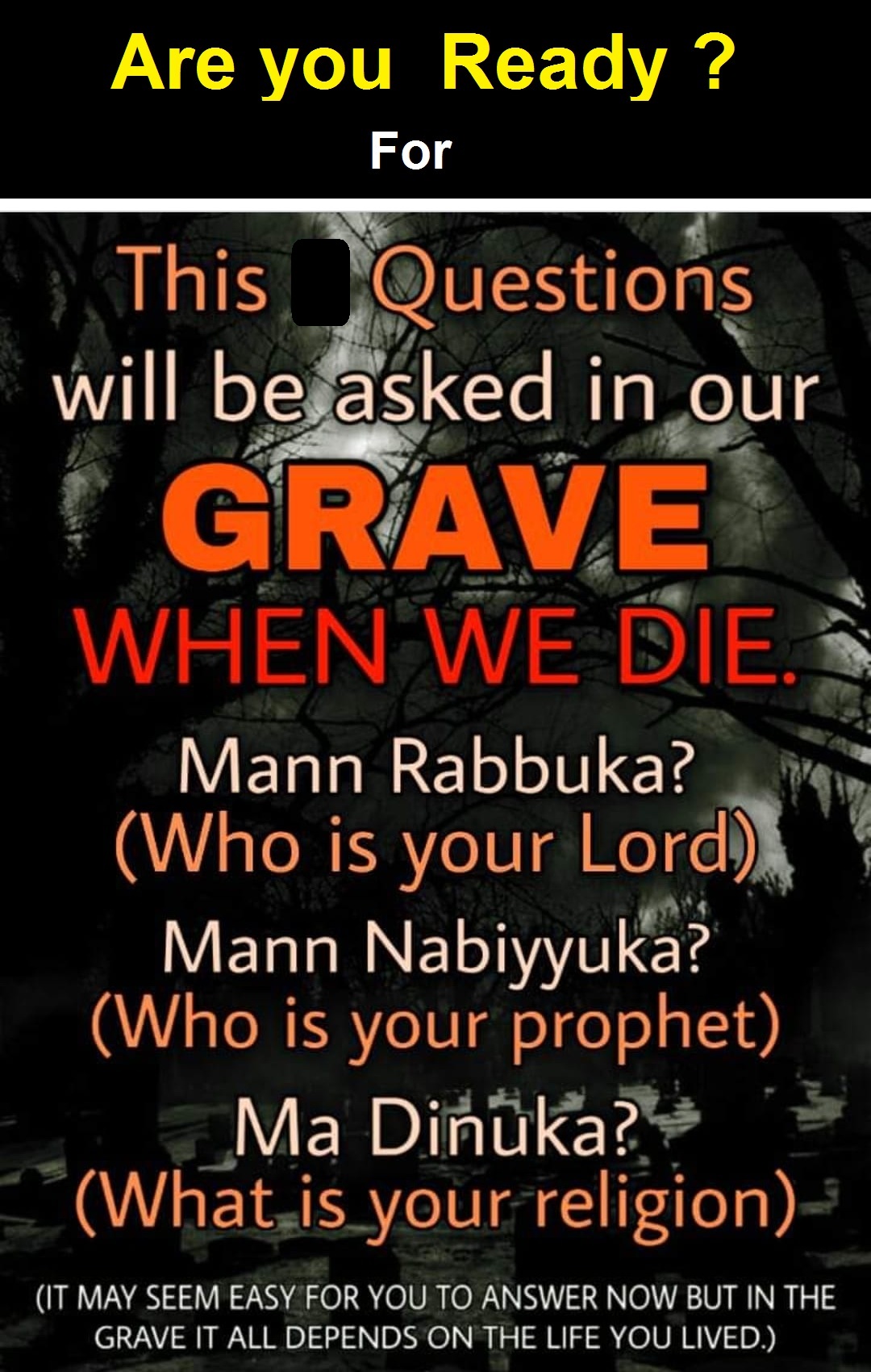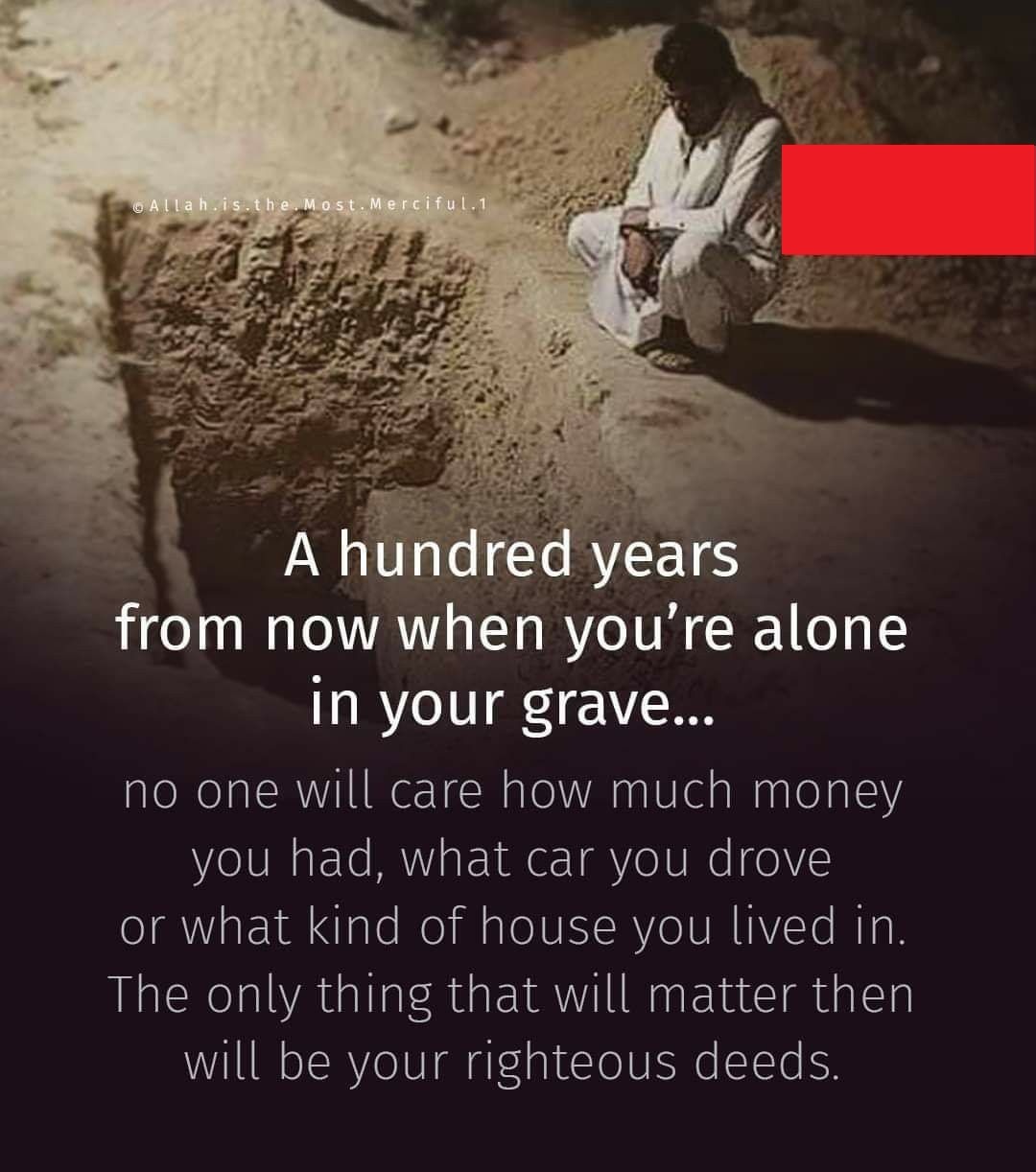 I'm not afraid of death, but I am afraid of the grave. Our first day in the grave, we have no idea how it feels to be in the grave. A new life, a new home and a new environment, grave is the first part of meeting with Allah SWT. Let's ask ourselves, if we are to die now? What deeds do we have to show before Allah ? Good or Bad?