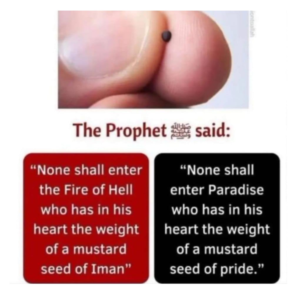 None shall enter the Fire (of Hell) who has in his heart the weight of a mustard seed of Iman and none shall enter Paradise who has in his heart the weight of a mustard seed of pride.